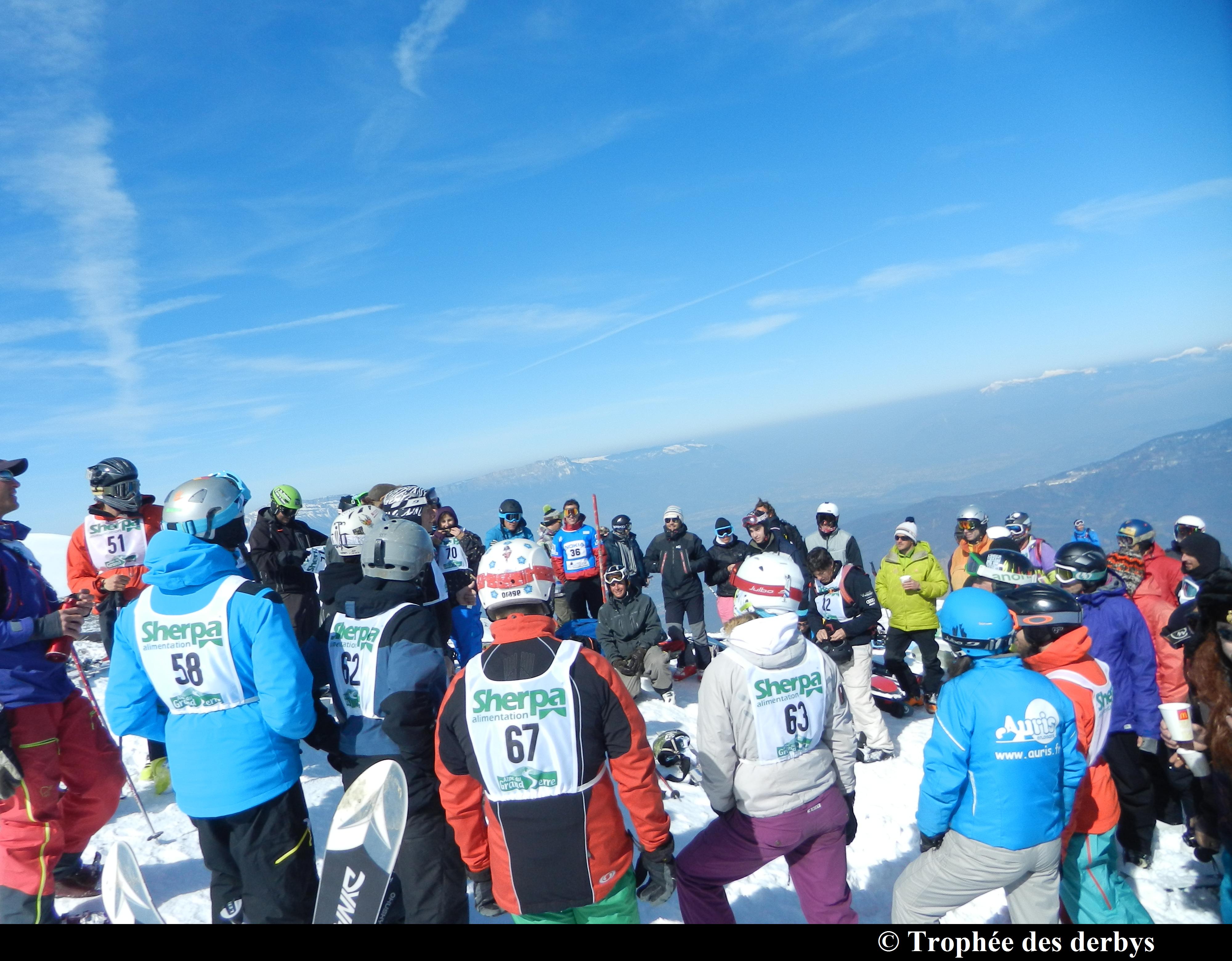 Derby en individuel avec un impressionnant départ 2 par 2 dans le célèbre "Entonoir" à l'Alpe du Grand Serre. Petite montée à pied (15mn en mode tranquille) pour atteindre le sommet de ce large goulet à la pente soutenue. Le derby s'est joué en deux manches sur le même parcours, c'est du pentu de haut en bas, alors pour gagner fallait oser tirer droit. Neige fraiche et soleil étaient au rendez vous.